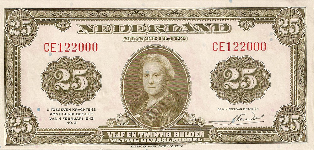 25 Gulden 1943-II muntbiljet. Alm.79-1. Prachtig/UNC.