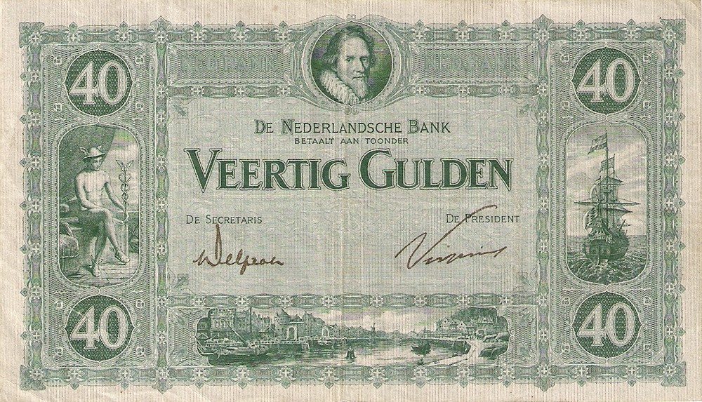 40 Gulden 1921 bankbiljet. 23 februari 1923. Delprat/vissering. Alm. 93-1b. Zeer fraai.