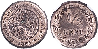 1/2 Cent 1885. NGC slab MS 65 RB. Topstukje!