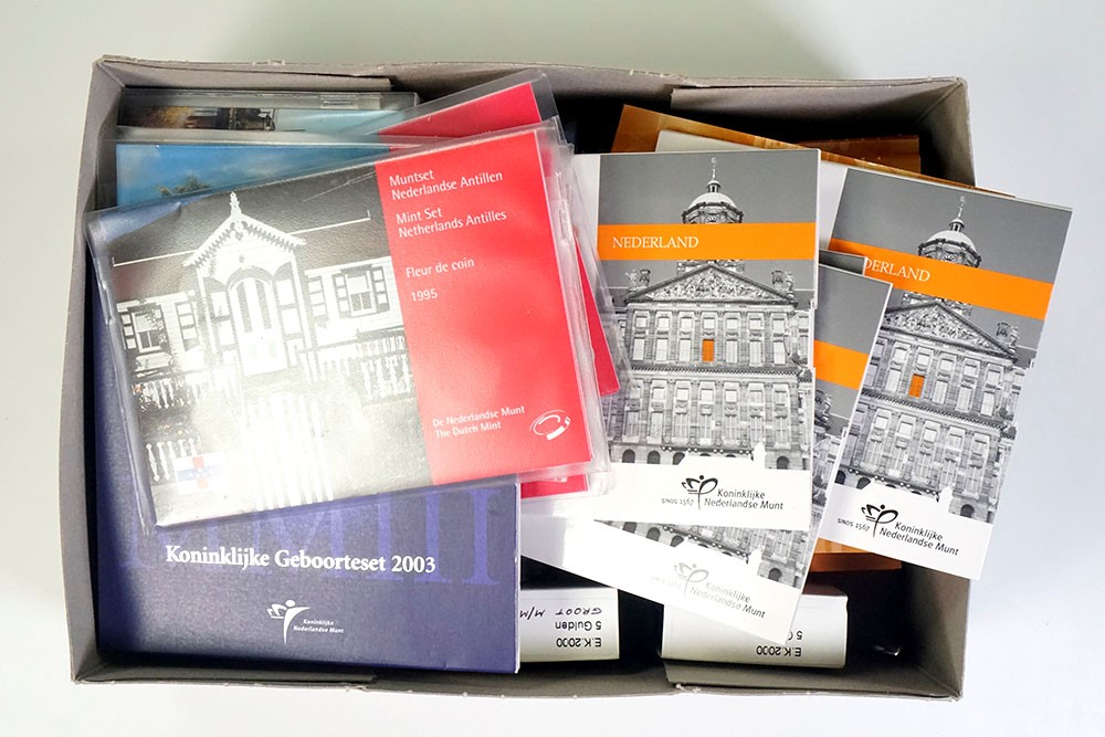 Jaarsets FDC/BU 1995(2), 98(9), 99, 2004(15), 13(4). Themaset BU 2003. Jaarset Proof 2004. 5 Gulden EK 2000 gewoon en klein mmt. Ned. Antillen FDC set 1994(3), 95. 39 ex.