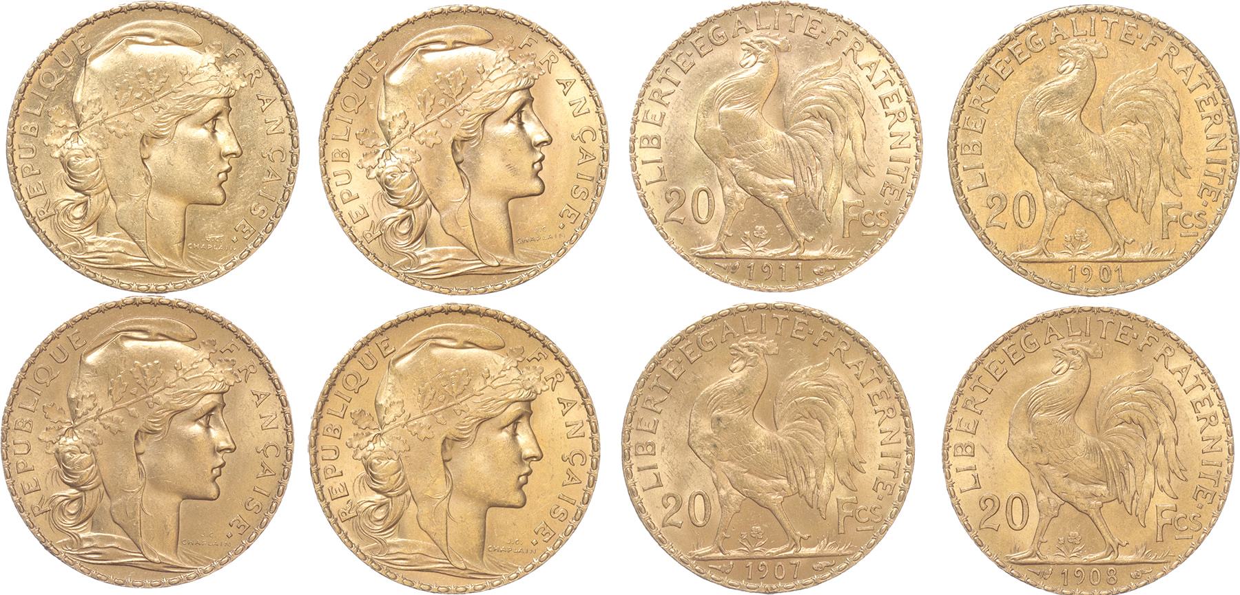 France. 20 Francs gold 1901, 1907, 1908, 1911. XF. 4 pcs.
