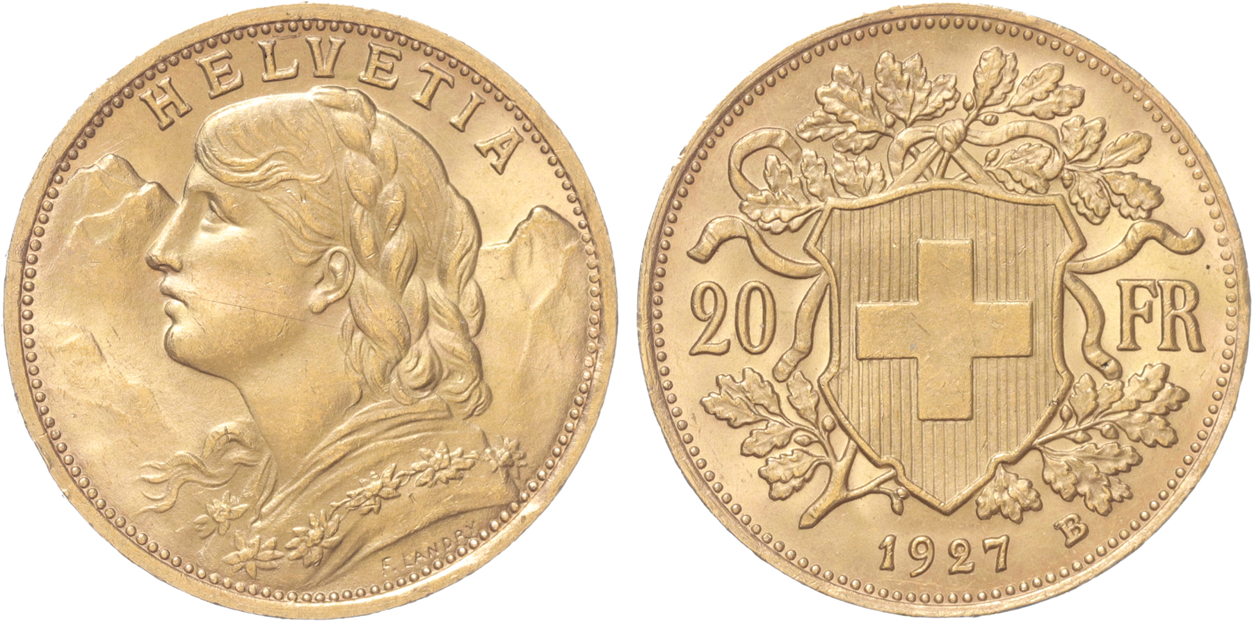 Switzerland. 20 Francs gold 1927B. XF.