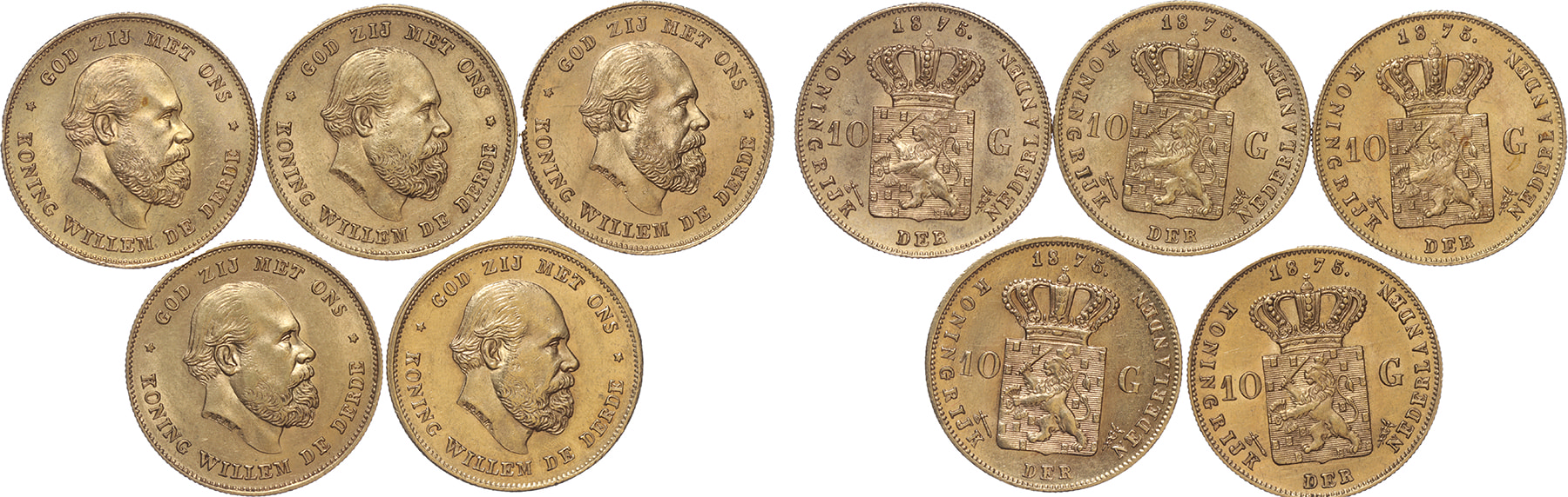 10 Gulden goud 1875. Prachtig/FDC. 5 ex.