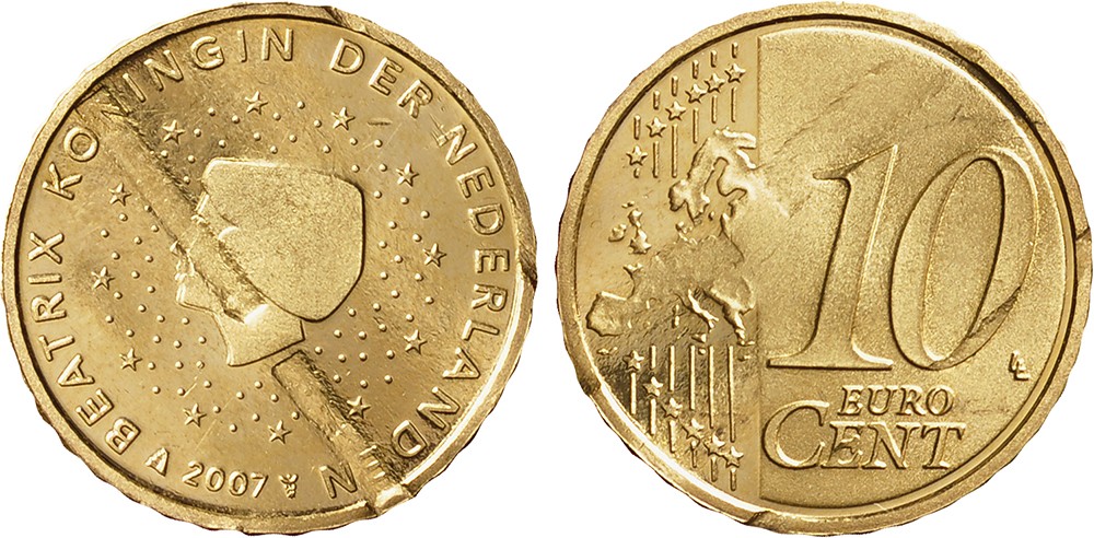 10 Cent 2007. Munt heeft klem gezeten in machine, gewokkeld uiterlijk.