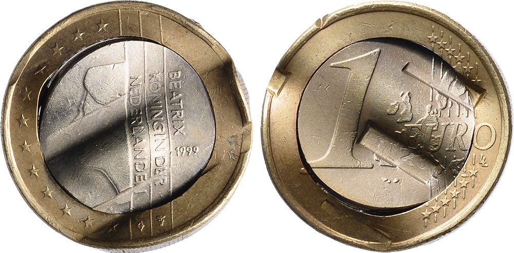 1 Euro 1999. In muntpers geklemd geweest, gewokkeld uiterlijk.