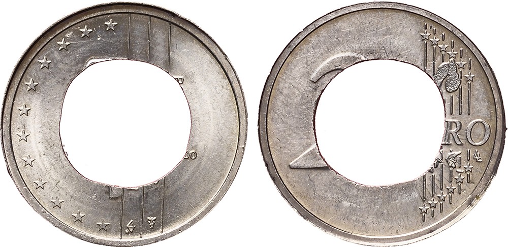 2 Euro 2000. Ontbrekende kern en te grote buitenrand. Mogelijk ander metaal.