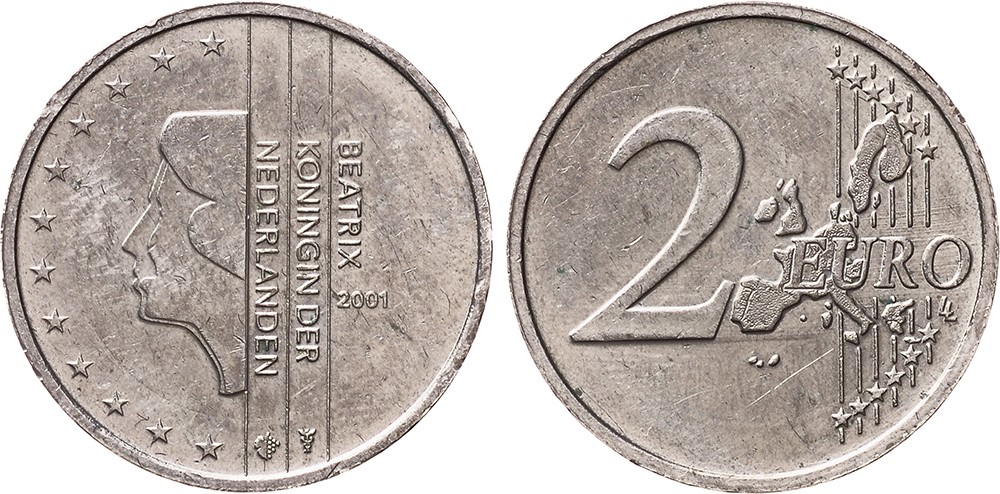 2 Euro 2001. Geslagen in ander metaal, zowel kern als rand, waarschijnlijk nikkel. 8,85 gr.