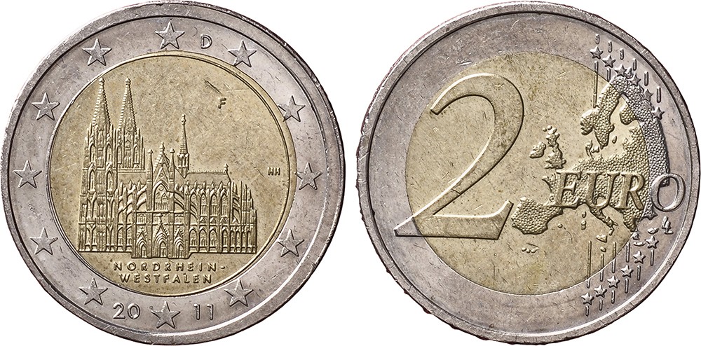 2 Euro 2011. Dom van Keulen. Decentrisch geslagen.