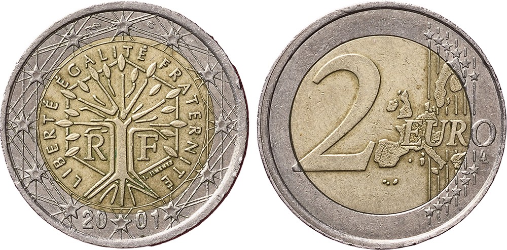 2 Euro 2001. Kern decentrisch waardoor jaartal gedeeltelijk op de kern geslagen.