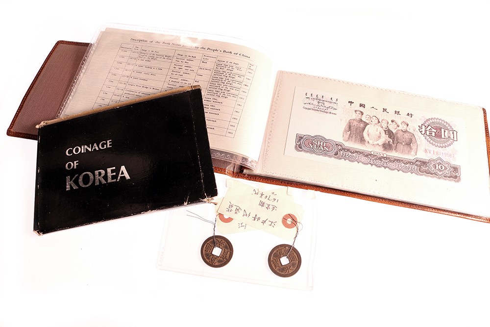 China 1980 Paper money set hosting 10 different unc notes. Issued by The Peoples Bank of China. China 2 cash coins. Mintset of Korea hosting 10 type coins.
