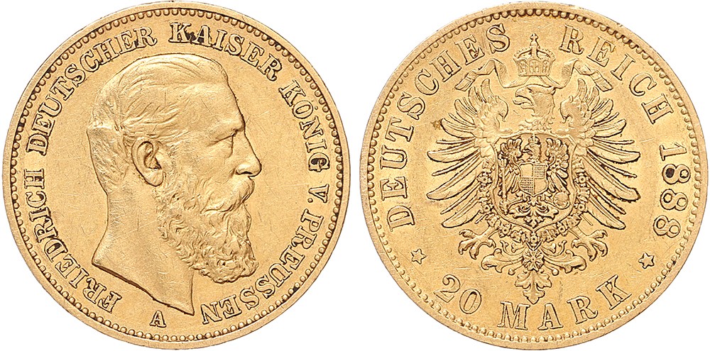 Prussia. 20 Mark 1888A. KM 505. VF.