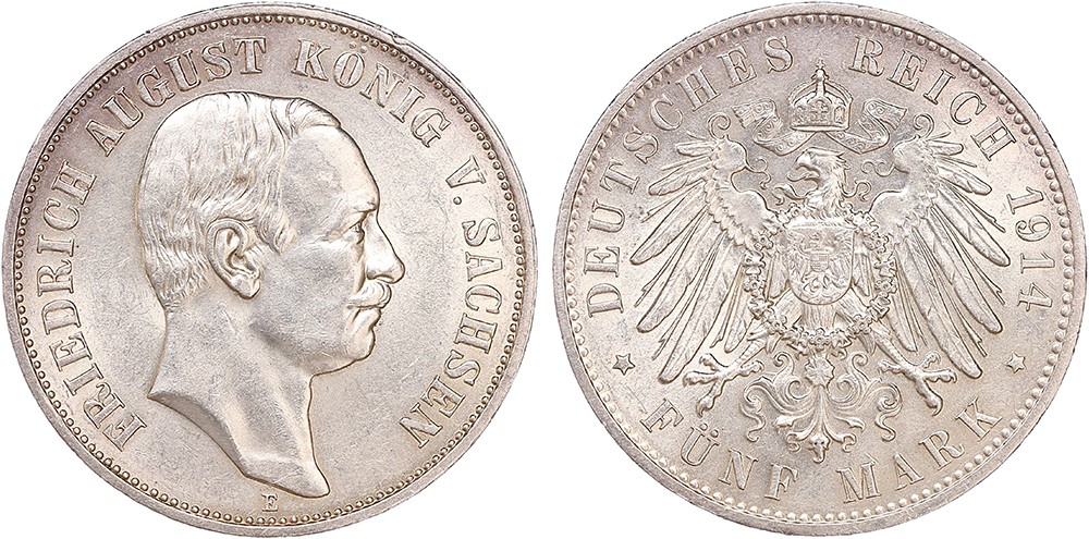 Saxony-Albertin. 5 Mark 1914E. KM 1266. UNC.