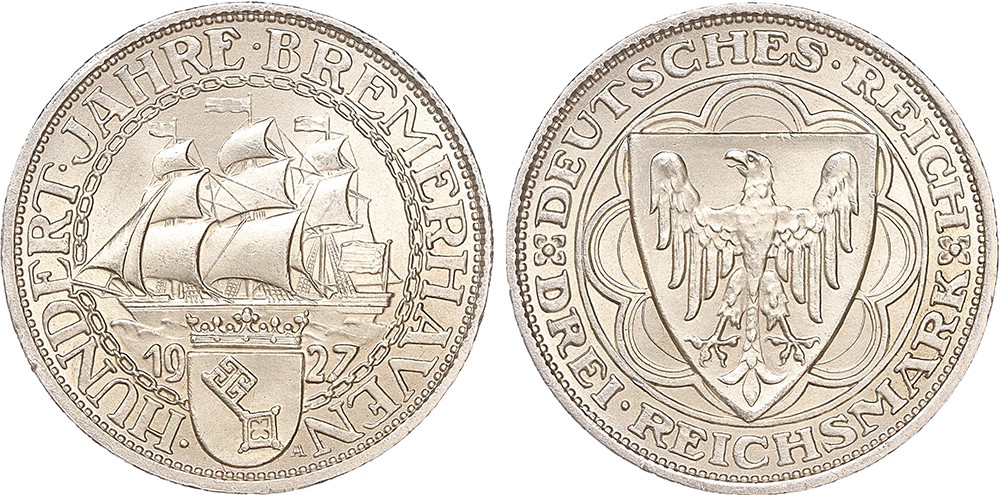 Weimar Republic. 3 Mark 1927A. KM 50. UNC.