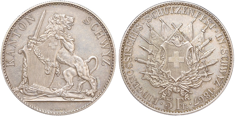 Switzerland. 5 Francs 1867. Schwyz. X#S9. XF.