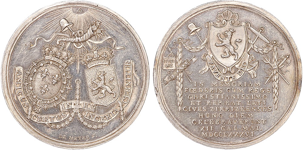 1786. Penning Fontainebleau: FEESTEN WEGENS VERDRAG VAN FONTAINEBLEAU / TREATY OF FONTAINEBLEAU FESTIVITIES 1786, by door De Meyer. Wapens van Frankrijk en Nederland onder vrijheidsspeer en cornucopia. Kz. Stadswapen van Zierikzee, daaronder 9-regelige tekst. Vvl. 641.AR 34,4 mm.