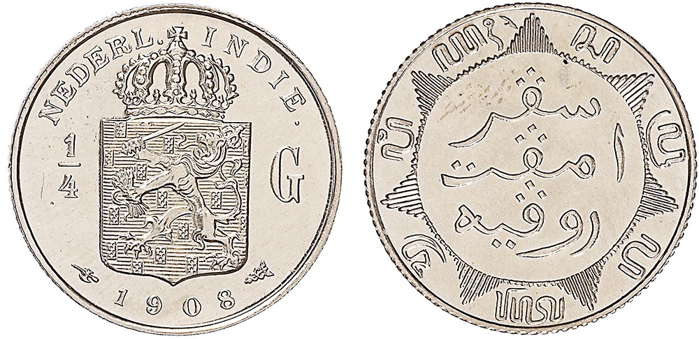 1/4 Gulden 1908. Met gepolijste stempels geslagen. PROOF. Zeldzaam.