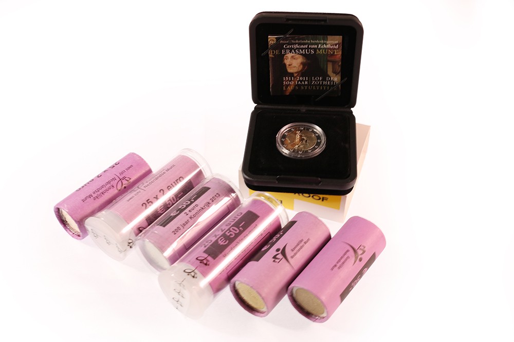 Lot 2 euromunten complete rol 2007(2), 2012, 13, 14, 15 + 2 euro 2011 Erasmus proof in cassette.