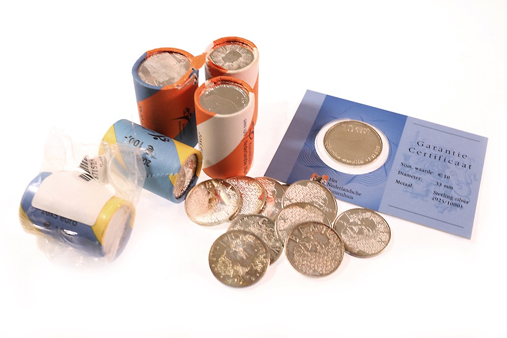 Herdenkingsmunten 5 en 10 euro w.o. zilver. Vnl. in complete rollen.