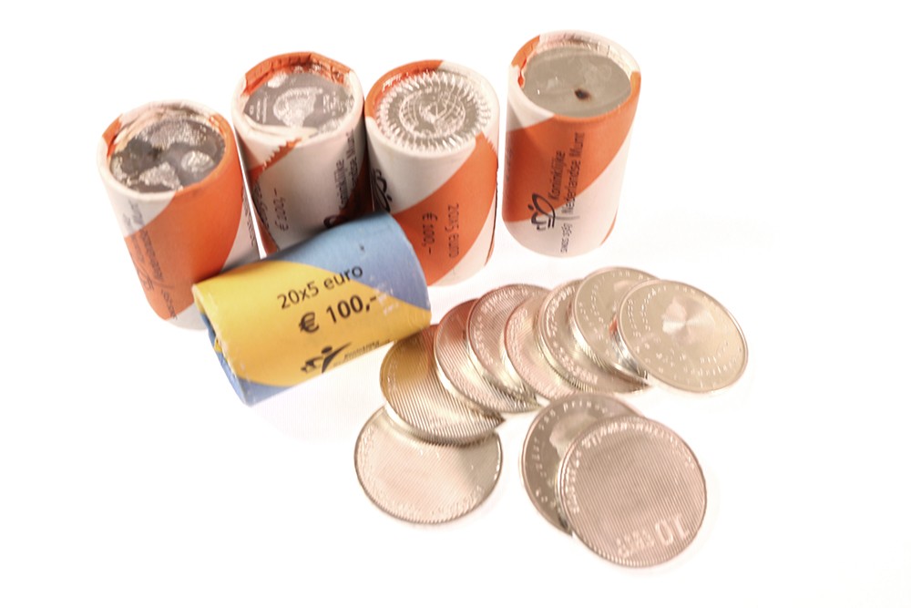 Herdenkingsmunten 5 en 10 euro w.o. zilver. Vnl. in complete rollen.