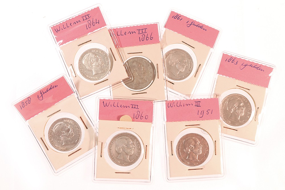 1 Gulden 1851, 58, 60, 61, 63, 64, 66. Zeer fraai en prachtig. 7 ex.