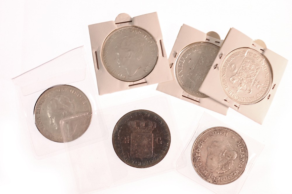2 1/2 Gulden 1874, 1938(3), 1943D en 10 gulden 1970.