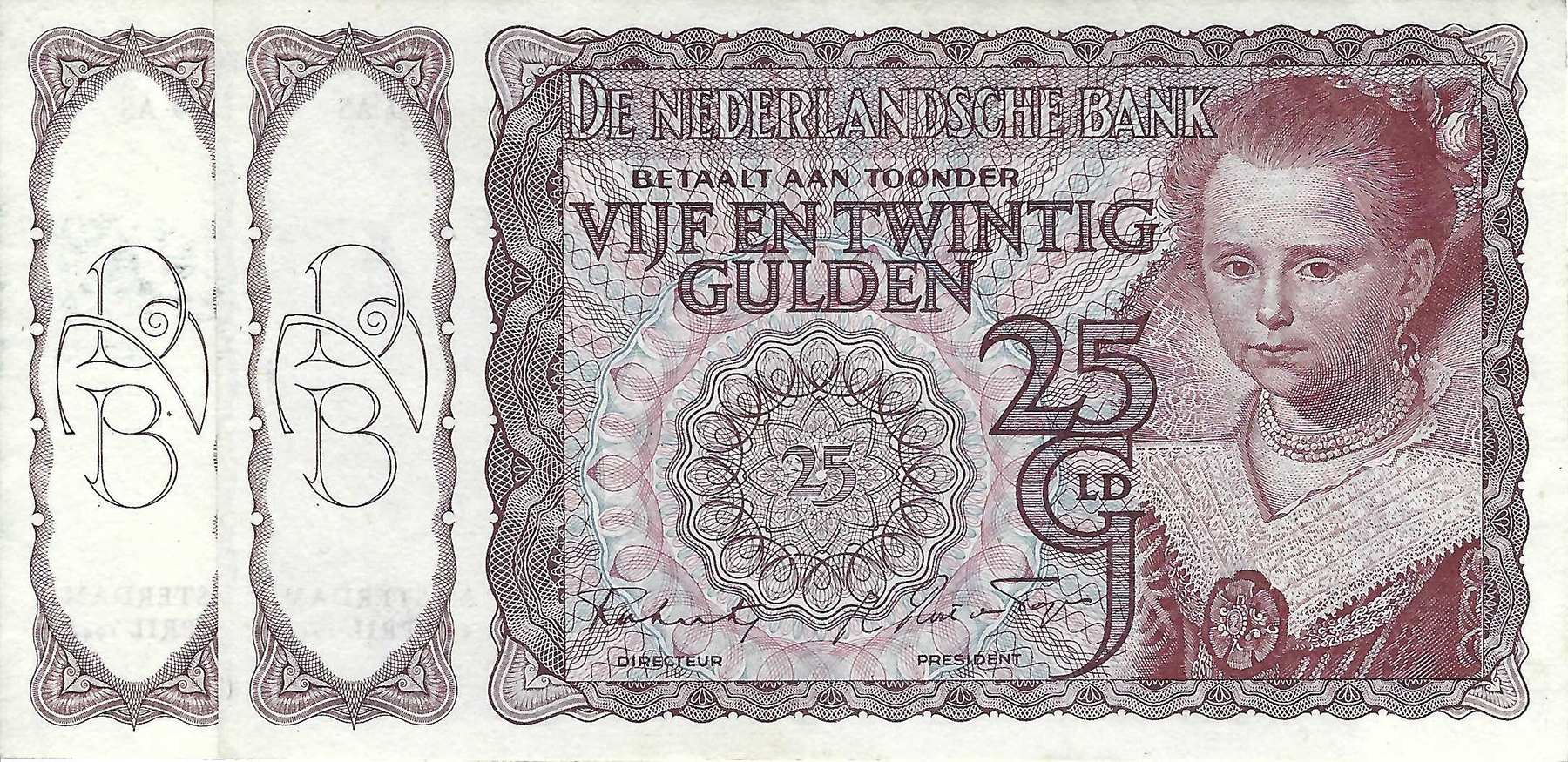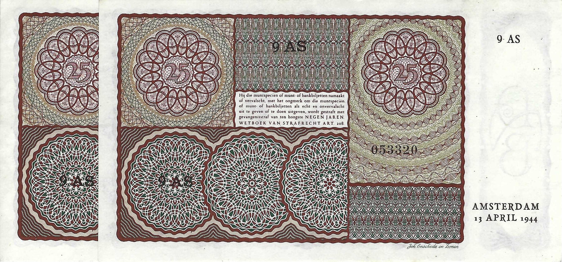 Netherlands. 25 Gulden 1943 I bankbiljet. Alm. 78-1a. UNC. 2 ex. opeenvolgende nummers!