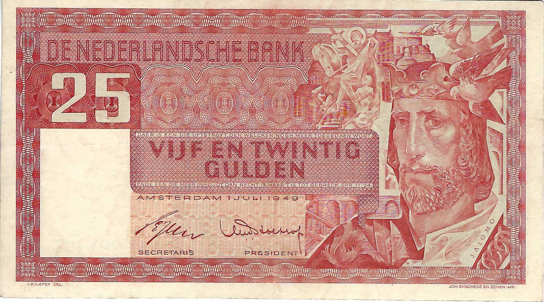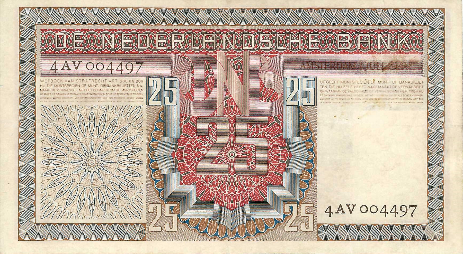 Netherlands. 25 Gulden 1949 bankbiljet. Alm. 82-1. Prachtig.