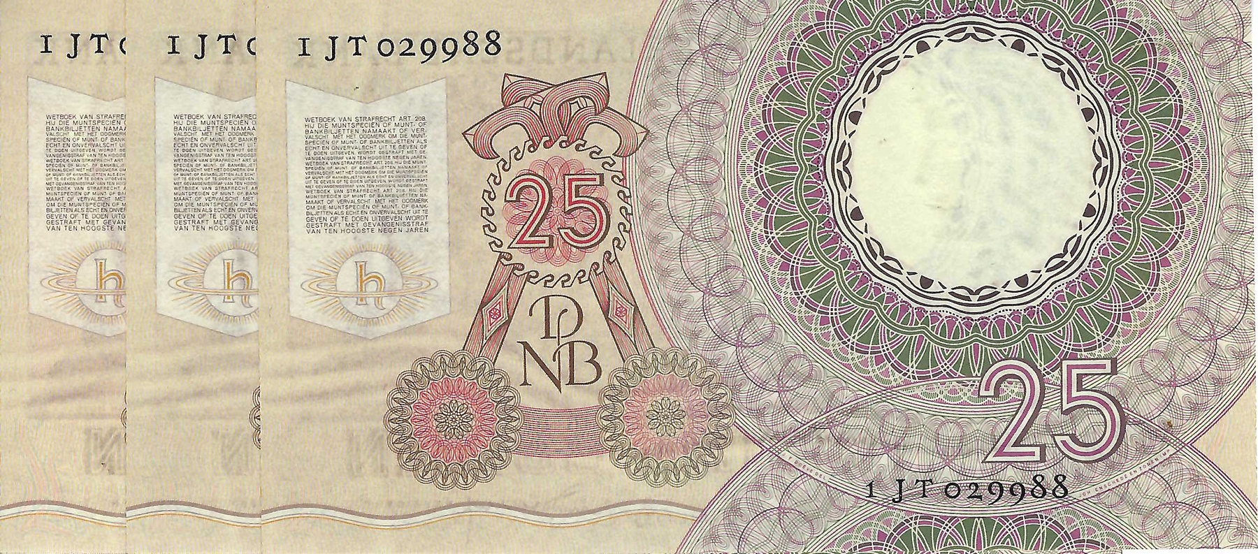 Netherlands. 25 Gulden 1955 bankbiljet. Alm. 83-1a. UNC. 3 ex. opeenvolgende nummers!