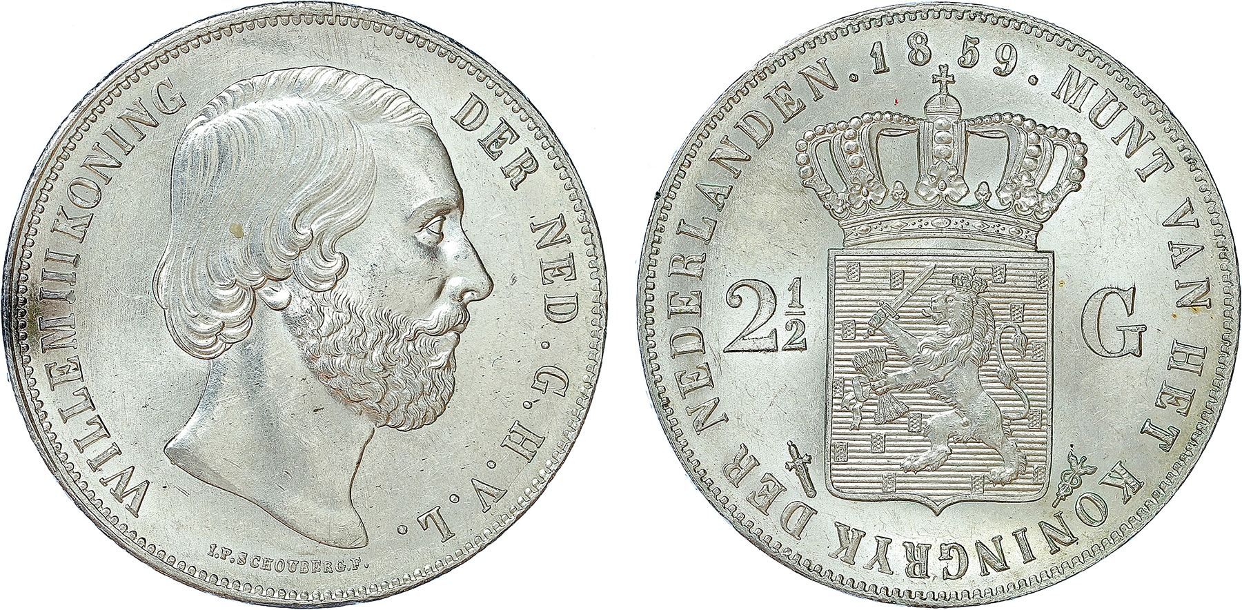 Netherlands. 2 1/2 Gulden 1859. Mooie rustige zilverkleur. FDC.