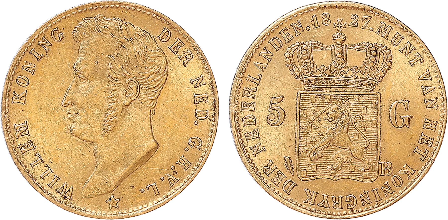 Netherlands. 5 Gulden goud 1827 Brussel. Type a. Met gesloten B van Brussel. Prachtig.