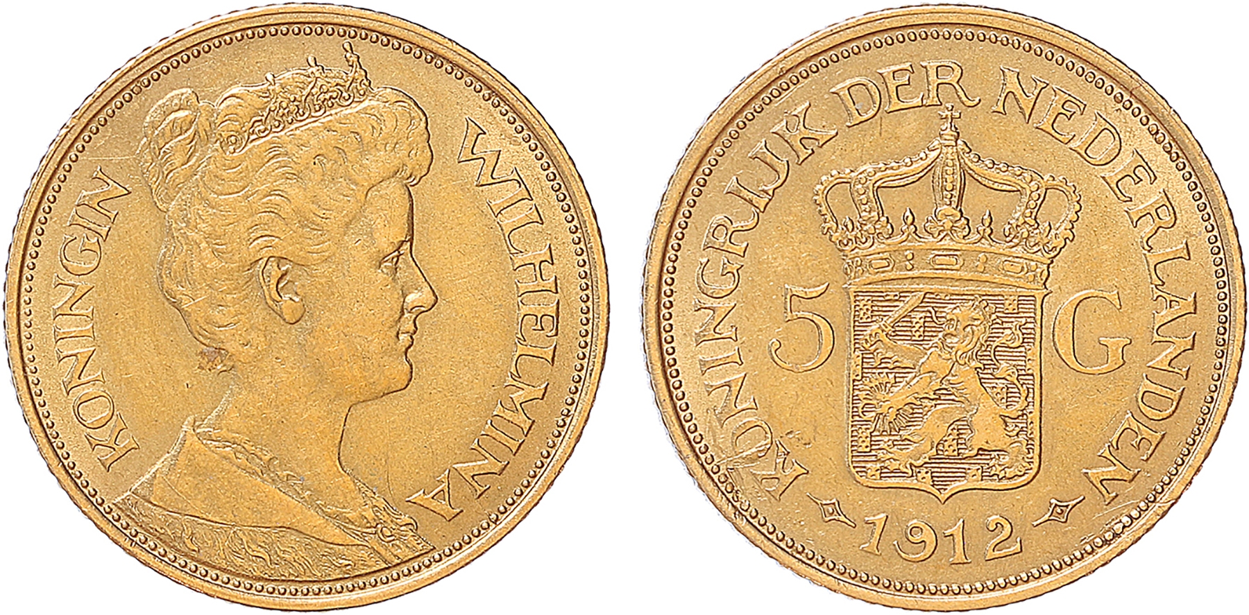 Netherlands. 5 Gulden goud 1912. Zeer fraai.