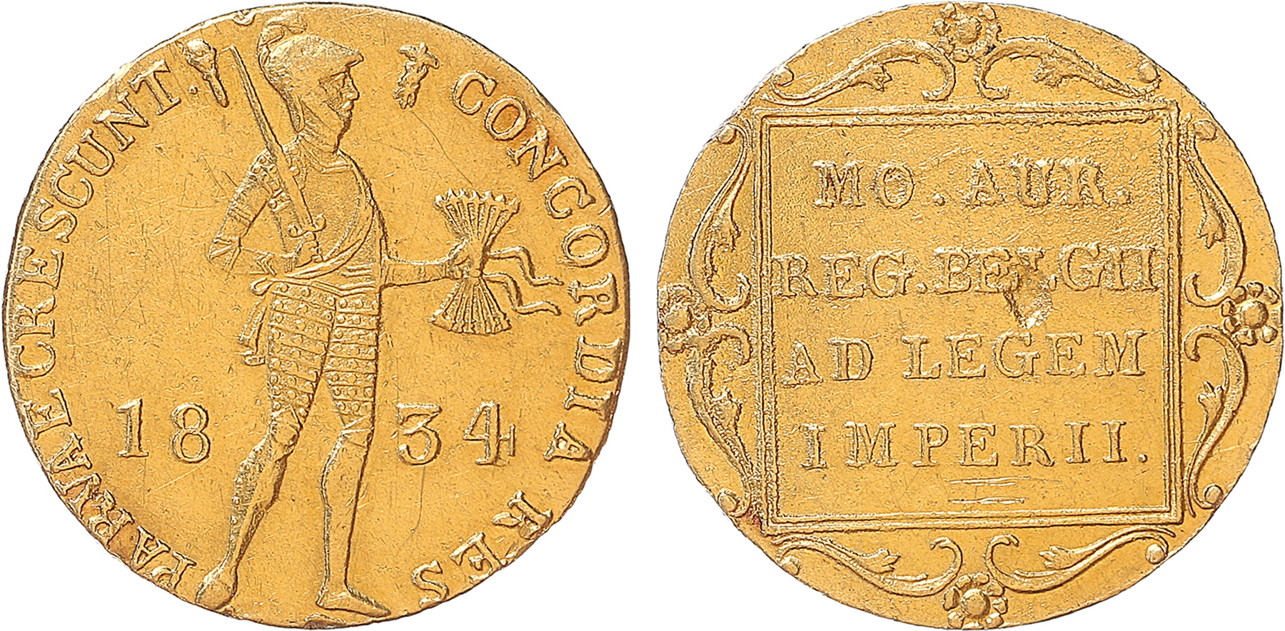 Netherlands. Gouden dukaat 1834. Putje in het veld op keerzijde. Ca. zeer fraai.