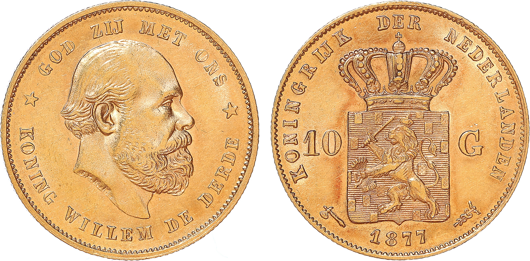 Netherlands. 10 Gulden goud 1877. Sch.551. Prachtig.
