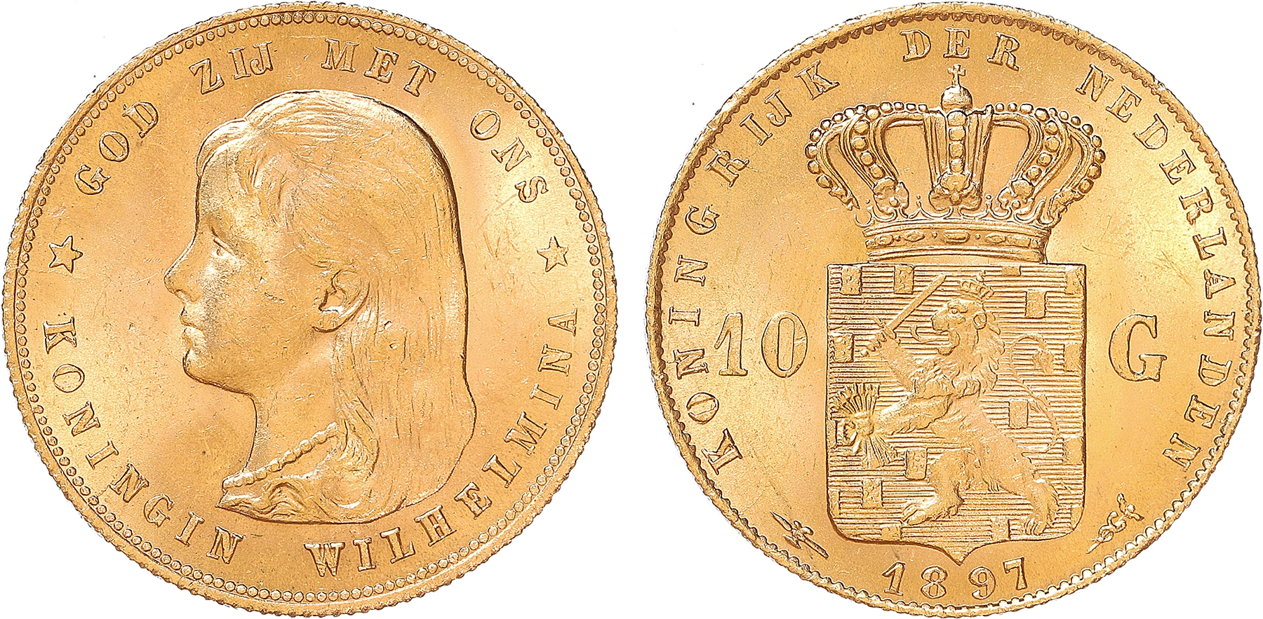 Netherlands. 10 Gulden goud 1897a. Parels vast. Sch.742. FDC.