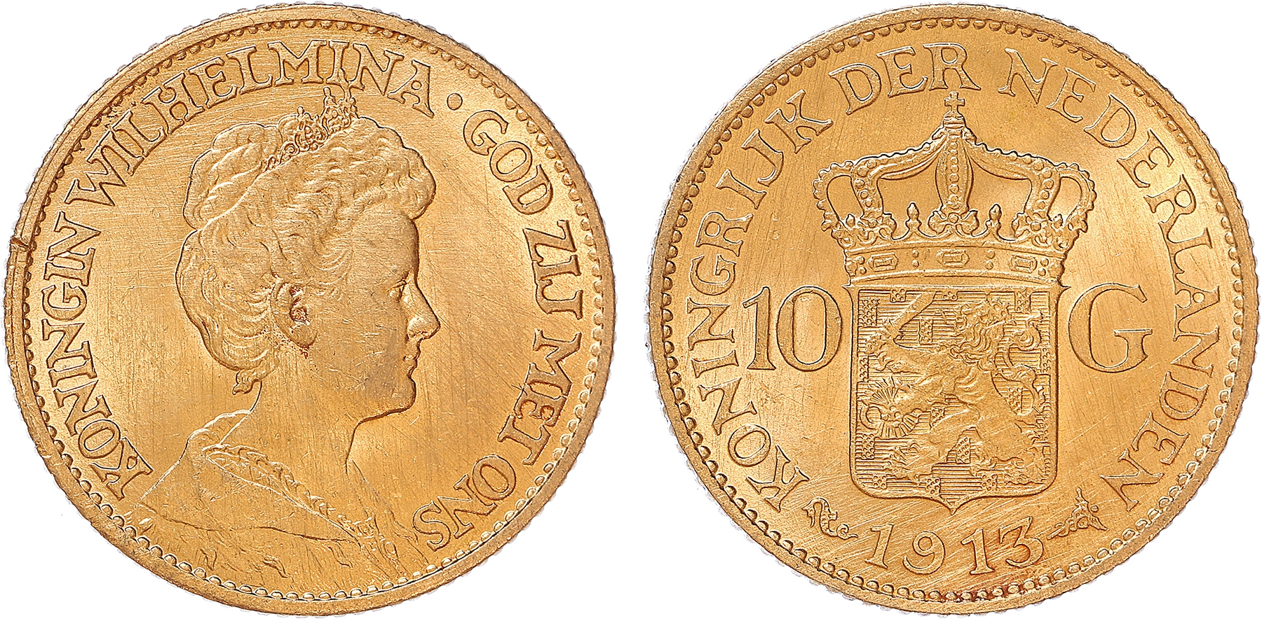 Netherlands. 10 Gulden goud 1913. Sch.747. FDC.