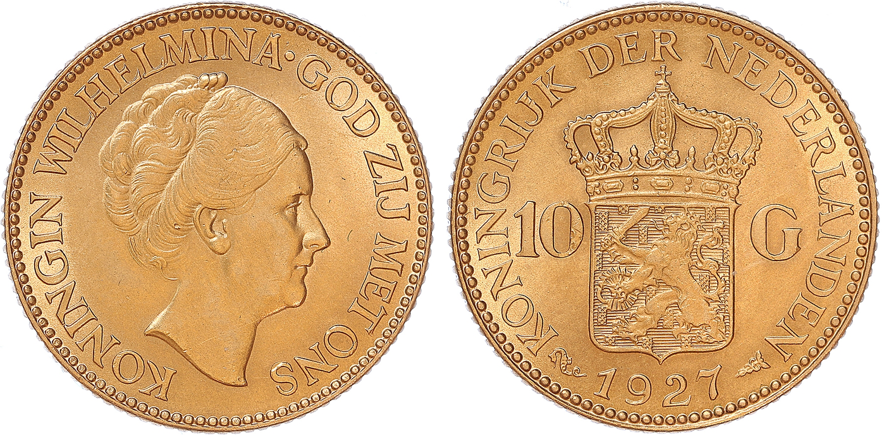 Netherlands. 10 Gulden goud 1927. Sch.751. FDC.