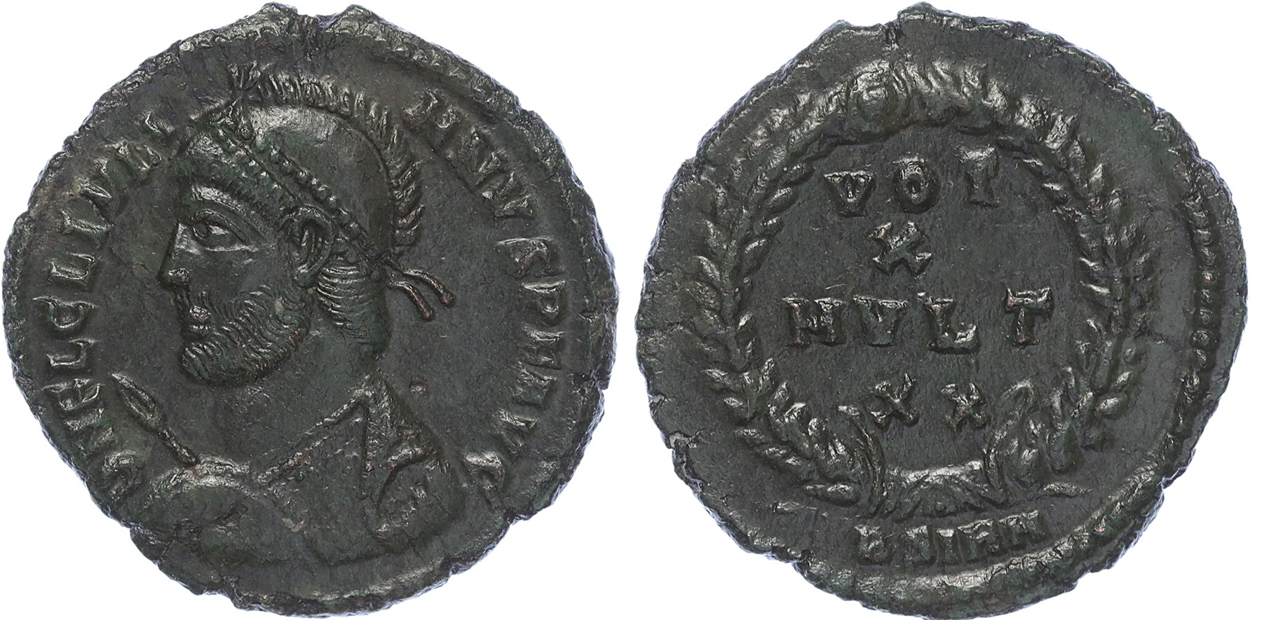 Julianus II Apostata (AD 360-363) - AE Follis (Sirmium AD 361 - 363, 3,05g). Coh. 151; RIC 108. a.XF. Ex. Henzen L 152/482
