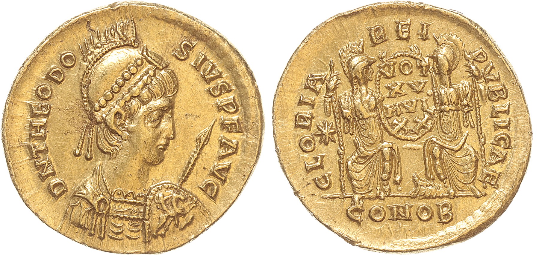 Theodosius II (AD 402-450) - AV Solidus (Constantinopolis AD 415, 4,34g). RIC 207; Hahn 5; Depeyrot 61-1. RR - XF, prachtexemplaar. Ex. Henzen L 166/651