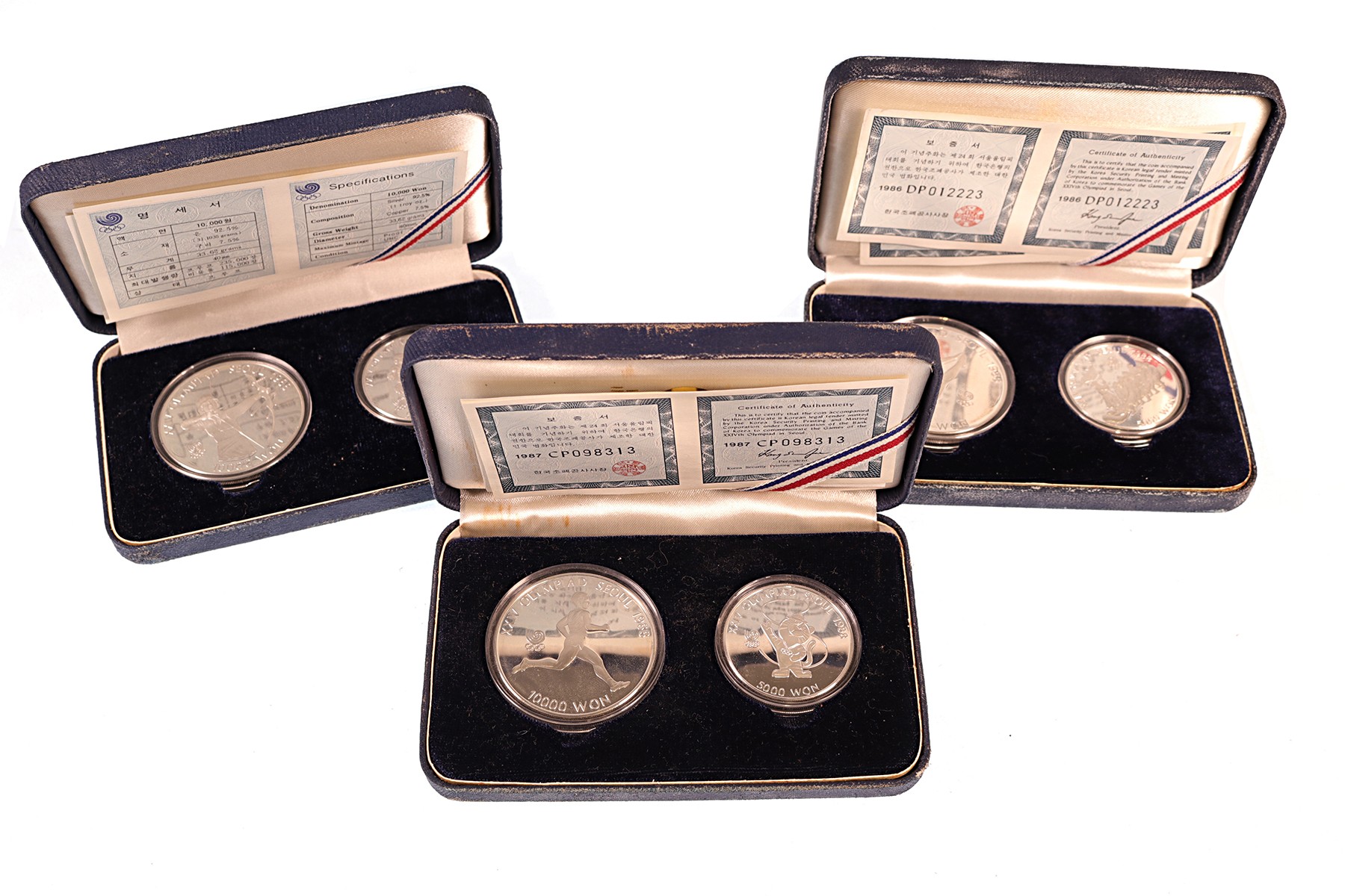 South Korea. Olympics 1988. 3 Silverset of 5000 and 10.000 won. Proof in boxes.