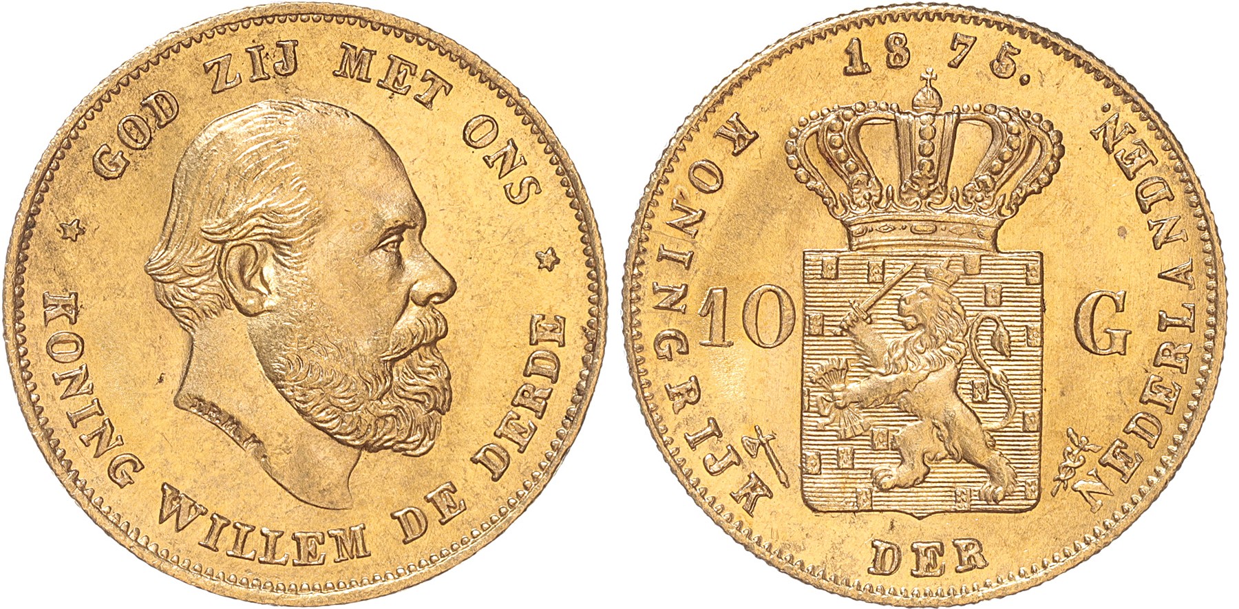 10 Gulden goud 1875/74. Niet eerder aangetroffen zeer duidelijke jaartalwijziging. Er moeten dus stempels met 1874 zijn gemaakt, welke niet gebruikt zijn en vervolgens door de muntmeester zijn aangepast voor de aanmunting in 1875. Interessant stuk, onze tip nu kopen en niet wachten tot het in de catalogus staat. Prachtig/FDC.