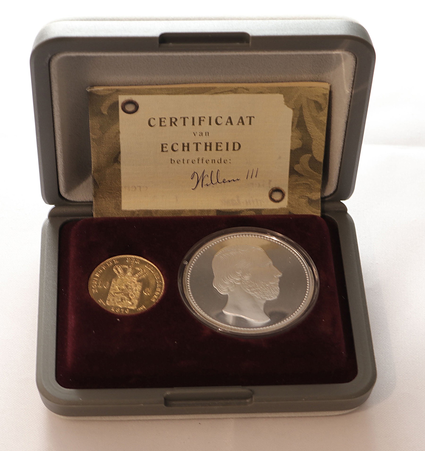 10 Gulden goud 1876 en zilveren penning in cassette.