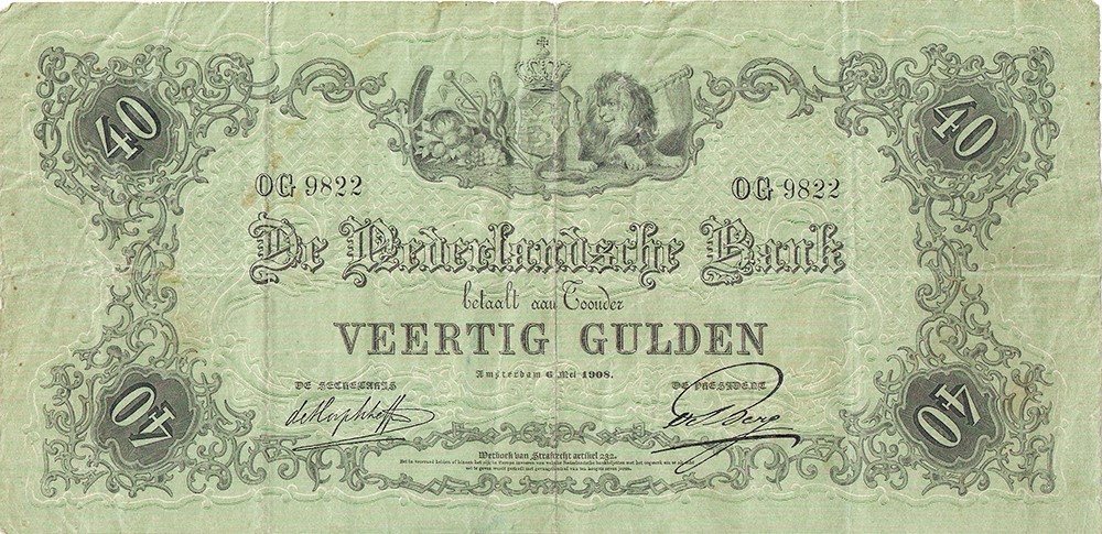40 Gulden 1860 bankbiljet. 6 mei 1908. Alm. 91-7. Bijna zeer fraai.