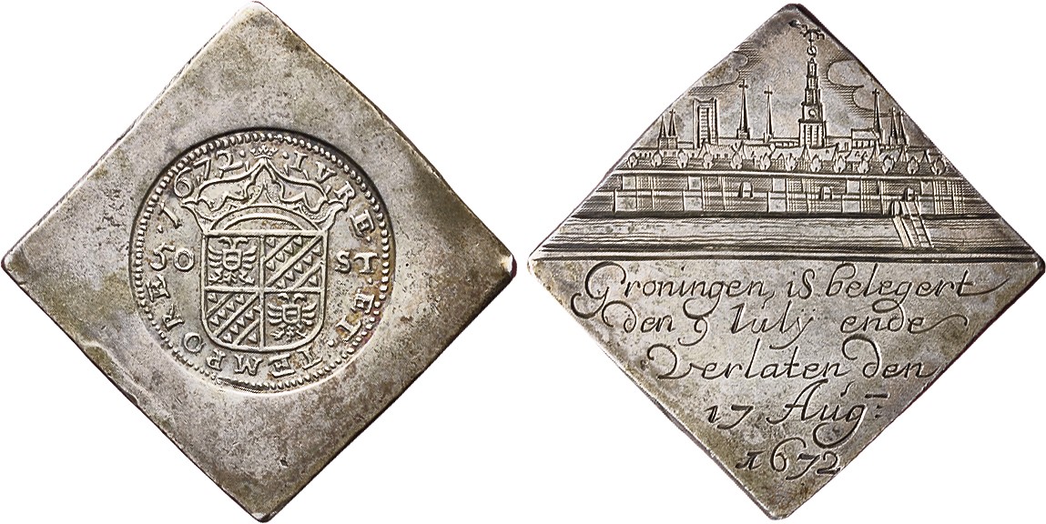 Rijksdaalder van 50 stuiver 1672. Cnm 2.20.2; D.736. Keerzijde met gegraveerd beel van de stad en tekst "Groningen is belegert Den 9 july ende Verlaten den 17 Aug 1672". Prachtig.
