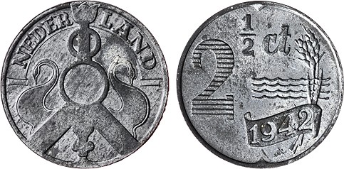 2 1/2 Cent 1942 zink. FDC. Mooie kleur. Uiterst zeldzaam topstuk! Gekeurd NVMH.