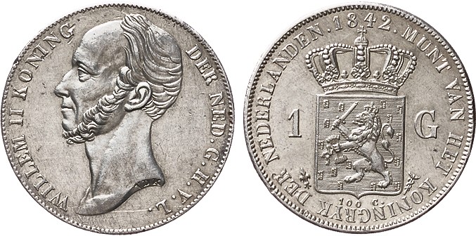1 Gulden 1842a. Kort borstbeeld. Zeer fraai+.