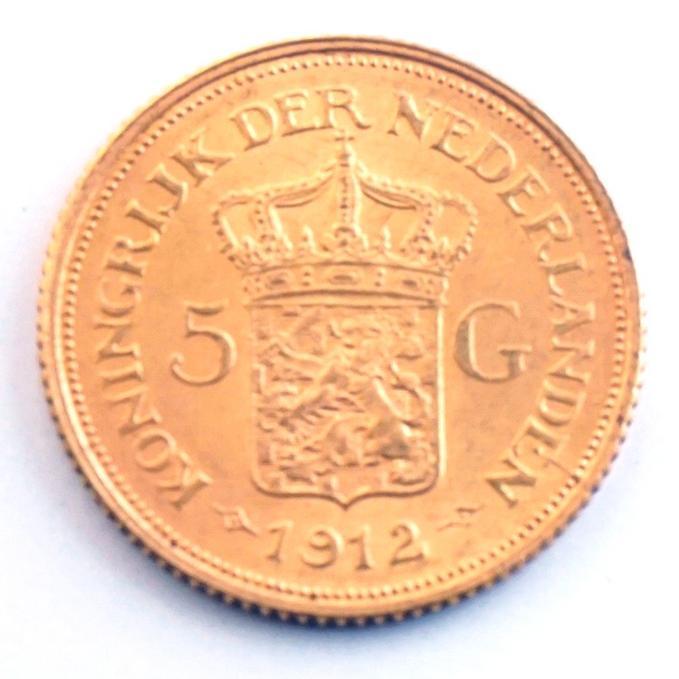 5 Gulden goud 1912. Prachtig+.