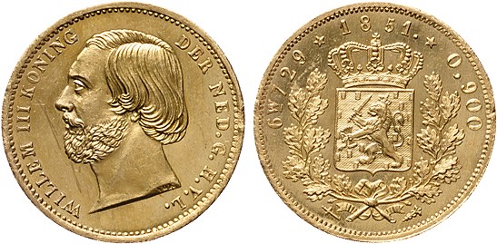 10 Gulden goud 1851. UNC. Mooie kleur.