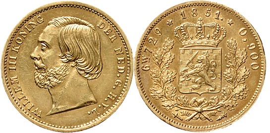 10 Gulden goud 1851. Prachtig+.