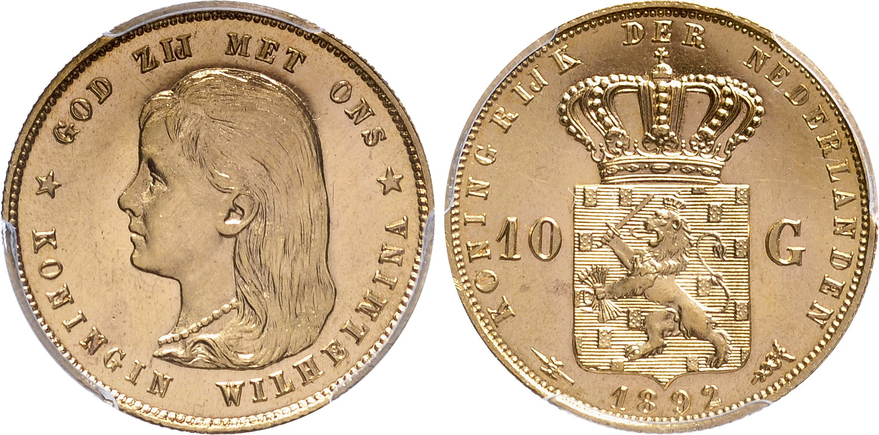 10 Gulden goud 1892. In PCGS slab MS 64. Uiterst zeldzaam topstuk, oplage 61 exemplaren. Dit is het enige ooit door PCGS gekwalificeerde MS 64 exemplaar! UNIEK STUK IN UNIEKE KWALITEIT!