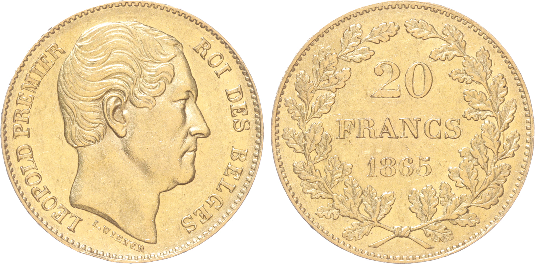 Belgium. 20 Francs gold 1865 pos. a. XF.